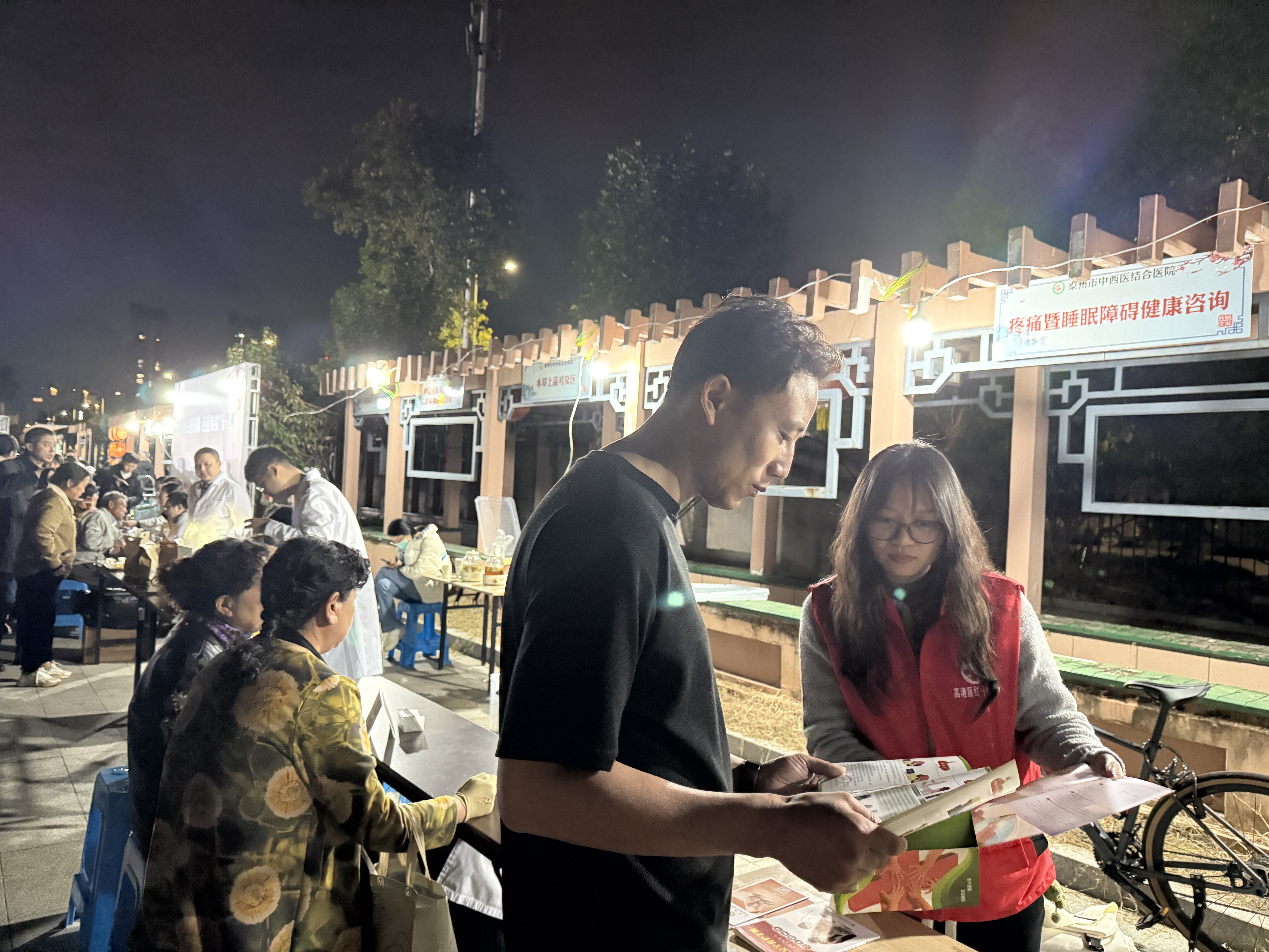 “立冬补冬,无病三分壮!”11 月 10日晚,一场以 “中医养生面对面 名医有约‘节气健’”为主题的中医夜市在明珠街道明珠社区广场热闹开市。本次活动明珠街道红十字会携手东明社区、明珠社区,以立冬节气为契机,将传统中医养生智慧与红十字公益服务相结合,为市民带来一场集义诊、科普、文艺于一体的健康公益长卷。 活动现场设置了中医养生区、养生体验区、公益咨询区、文艺演出区等功能板块。 中医养生区,十余处摊位有序排开,泰州市中西医结合医院骨伤科、脑病科等科室的十余名资深专家集体坐诊,把脉问诊、拔罐艾灸、中药茶饮等服务一站式铺开,现场各区域人头攒动。专家们以“望闻问切”结合现代医学,为居民解析睡眠障碍、颈肩腰腿痛等常见问题,量身定制调理方案。中药茶饮体验区,医师现冲祛湿茶饮、指导养生药膳,让中医药知识融入日常,帮居民提升养生意识。 夜色渐浓时,广场上的红马甲愈发鲜明 —— 那是红十字志愿者的身影,与广场的暖光交织成冬日里最动人的底色。 公益咨询区,红十字工作人员和志愿者向参加活动的群众普及急救知识,分发健康手册,耐心解答疑问,同时还为市民提供红十字应急救护培训报名、造血干细胞捐献咨询、无偿献血政策解读等服务,传递关爱与温暖,让公益之光在冬夜中熠熠生辉。 文艺演出区,演员们身着华服,载歌载舞,古筝、舞蹈、相声、戏曲等轮番上演,传统韵味与现代活力完美融合,为现场增添了一抹文化亮色,观众沉浸其中,感受着养生与艺术的和谐共鸣。 红马甲穿梭于人群,如点点星火,点亮了寒夜中的温情。居民们在欢声笑语中,不仅收获了健康知识,更体会到了社区大家庭的温暖与关怀。公益之光,不仅在夜市中闪耀,更在每个人心中悄然生根,滋养着这片土地上的每一份生命活力。 霜染的立冬夜,因这场中医夜市而暖意融融,红十字的红、中医的暖、文艺的韵,在冬夜里绘就了一幅满是温情的公益图景。